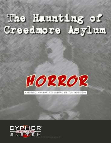 The Haunting of Creedmore Asylum is a self-contained horror adventure intended for a group of up to six players, of I’m guessing tier 1. The estimated completion time for this adventure is three to four hours, which I can say from personal experience is an accurate estimate. At its most basic this adventure is a crawl through a haunted “house” tainted by the echoes of horror, madness, and tragedy. The adventure takes a bit of an all roads lead to Rome approach, while there are some event that need to should happen before then end the adventure, the characters are largely let loose to free roam the asylum taking in its mysteries and horrors as they go. Speaking of horrors, the adventure makes good use of the shock and madness rules found in the Cypher System Rulebook, with slight tweaks. Each encounter with a creature, horrifying experience, or strange phenomenon is preceded by a shock level for the encounter. The end result is a real sense that the characters are being slowly, or not so slowly, being driven mad by their experiences.